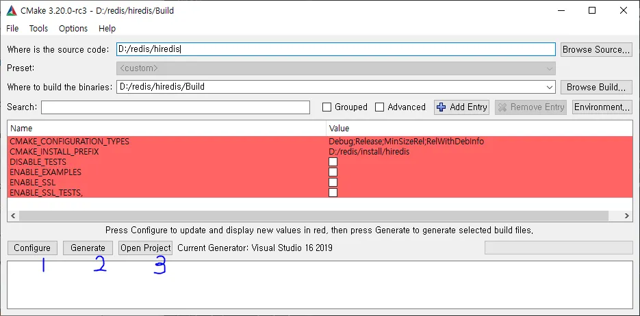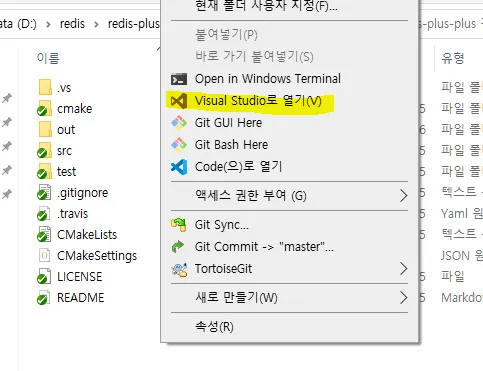 이 순서로 누르면 위의 build 폴더 안에 visual studio project 파일이 만들어진다.