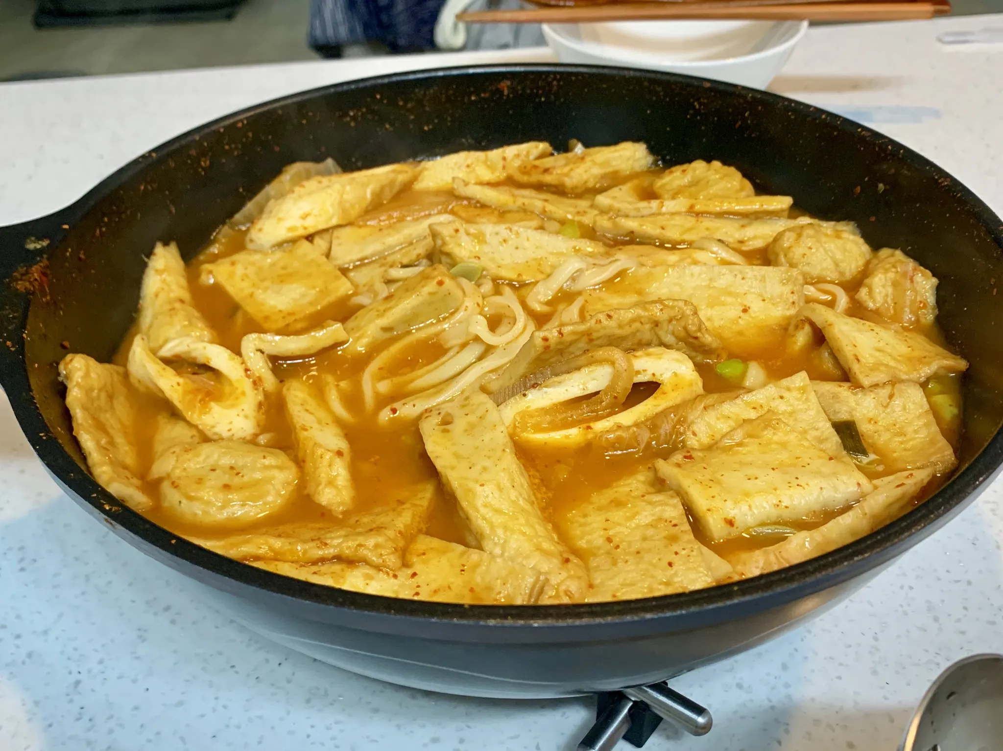 보글보글 끏으면 한 입 크기로 자른 오뎅을 넣습니다. 둥근 오뎅은 칼집을 넣어주어 간이 조금 더 잘 스며들게 해 줍니다.