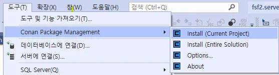 Visual Studio의 도구 → Conan Package Management에서 Install을 선택