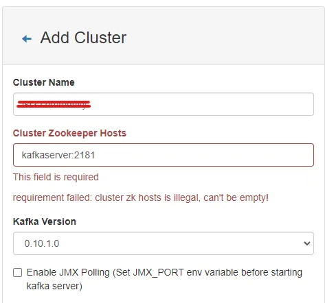 Cluster Zookeeper Hosts - hostname of zookeeper (docker-compose.yml ํ์ผ์ ๊ตฌ์ฑ๋ kafkaserver